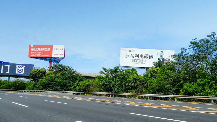 成南高速廣告(成巴高速交匯處左):該戶外廣告所處路段是成都往川東北方向的主要出川通道,車流量8萬左右,事業(yè)開闊,推廣效果好。