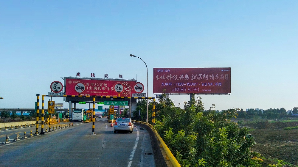 成雅高速廣告(繞城收費站入口),該戶外大牌視野效果開闊,車流覆蓋機場高速、會展中心、南延線以及劍蘭大道等路段。