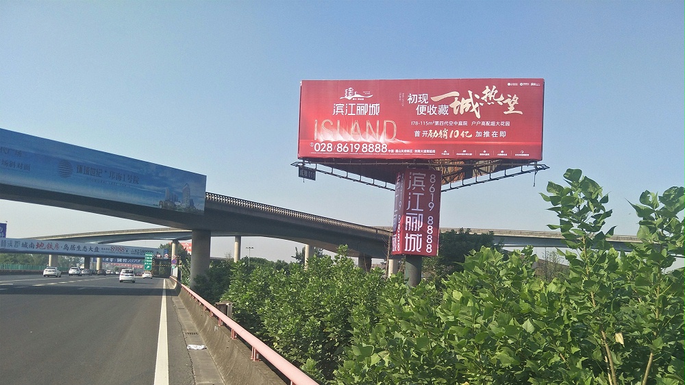 成雅高速廣告(與繞城交匯):該戶外廣告覆蓋環(huán)球中心、南延線以及劍蘭大道等路段來往車流。三面 單立柱廣告醒目,效果極佳。